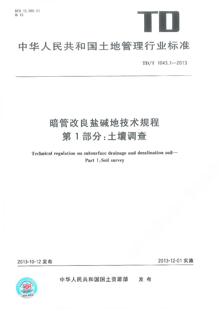 TD/T 1043.1-2013 暗管改良盐碱地技术规程 第1部分:土壤调查