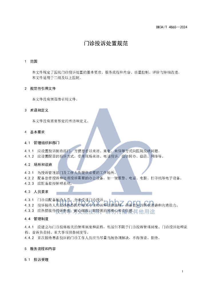 DB34/T 4865-2024 医院门诊投诉处置规范