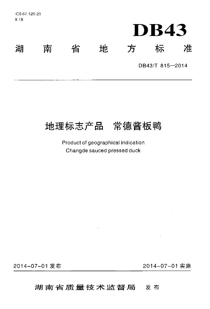 DB43/T 815-2014 地理标志产品 常德酱板鸭
