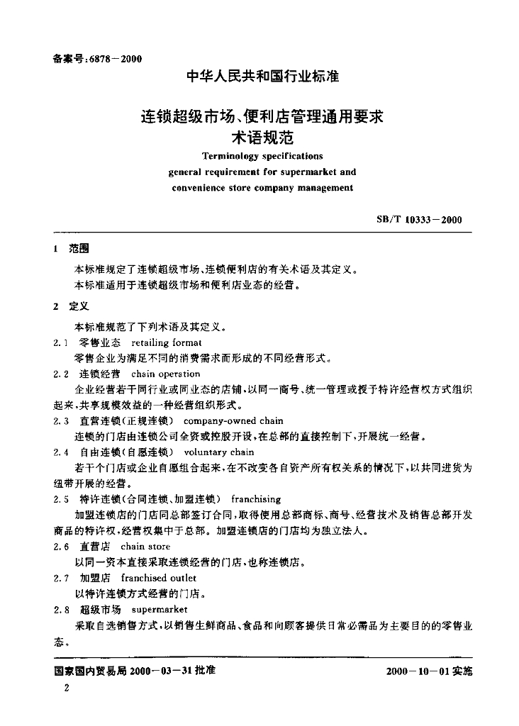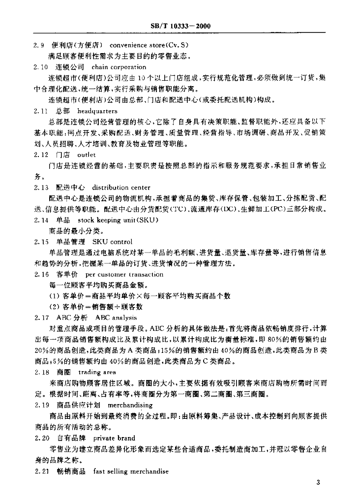 SB/T 10333-2000 连锁超级市场、便利店管理通用要求 术语规范