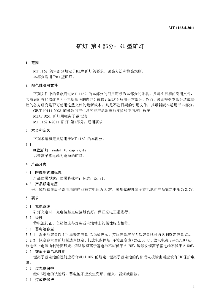 MT 1162.4-2011 矿灯 第4部分 KL型矿灯