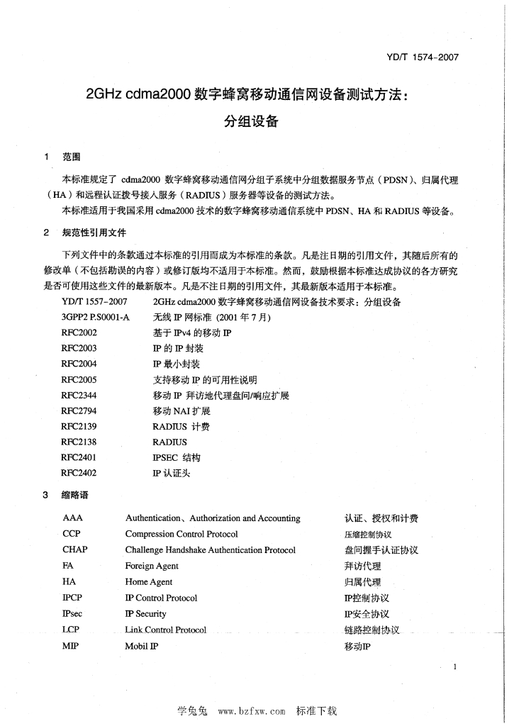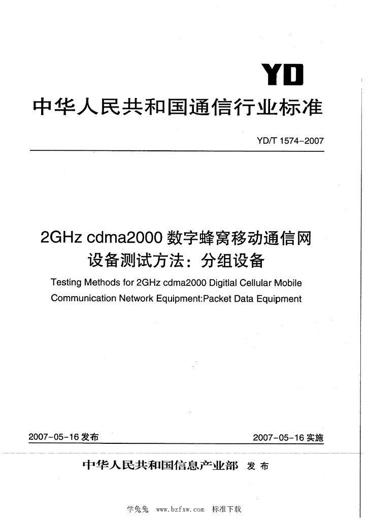 YD/T 1574-2007 2GHz cdma2000数字蜂窝移动通信网设备测试方法分组设备