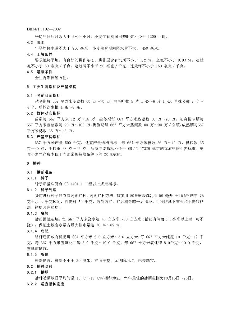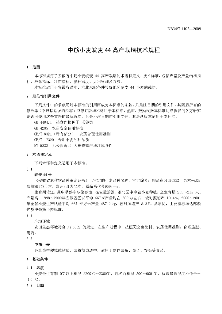 DB34/T 1102-2009 中筋小麦皖麦44高产栽培技术规程