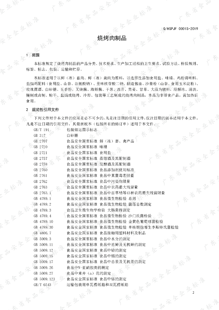 Q/HSPJF 0001S-2019 烧烤肉制品