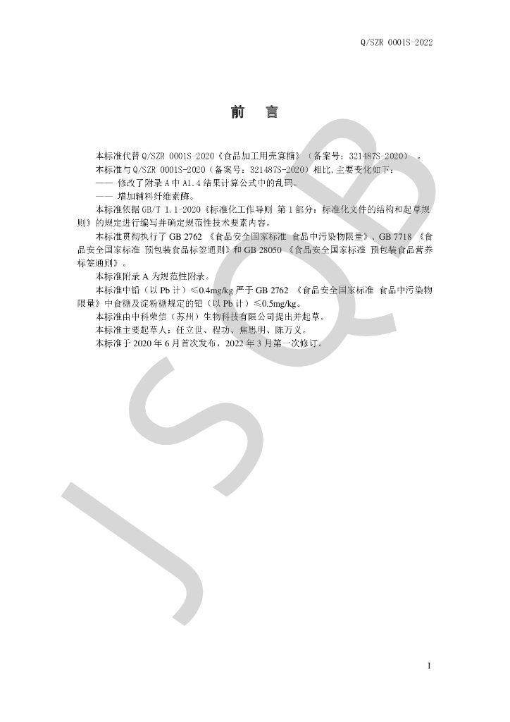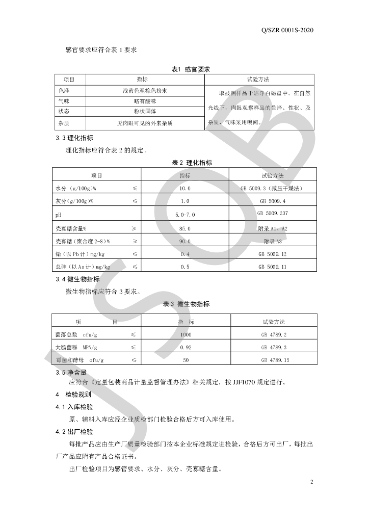 Q/SZR 0001S-2022 食品加工用壳寡糖