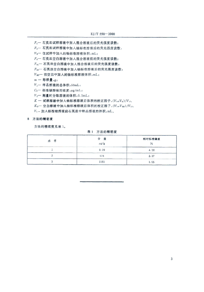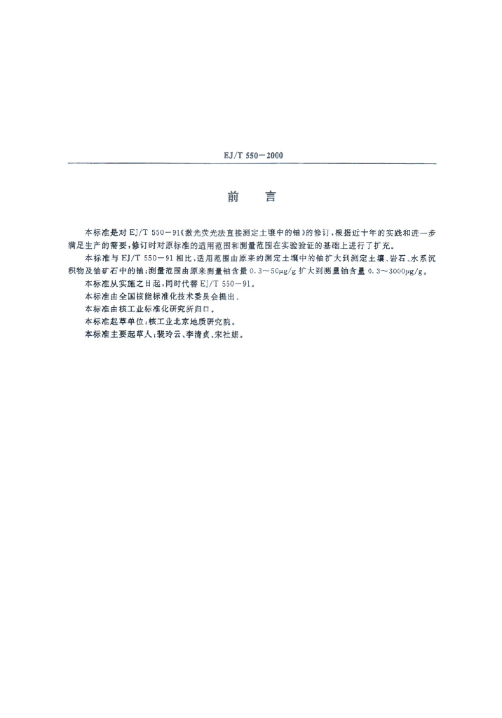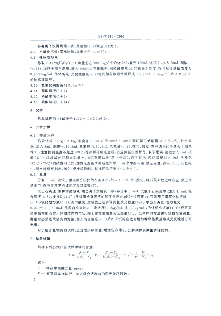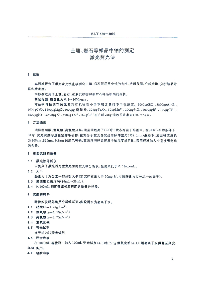 EJ/T 550-2000 土壤、岩石等样品中铀的测定激光荧光法