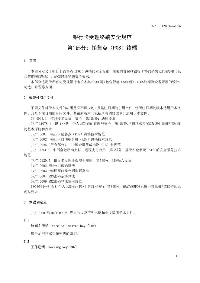 JR/T 0120.1-2016 银行卡受理终端安全规范 第1部分:销售点(POS)终端