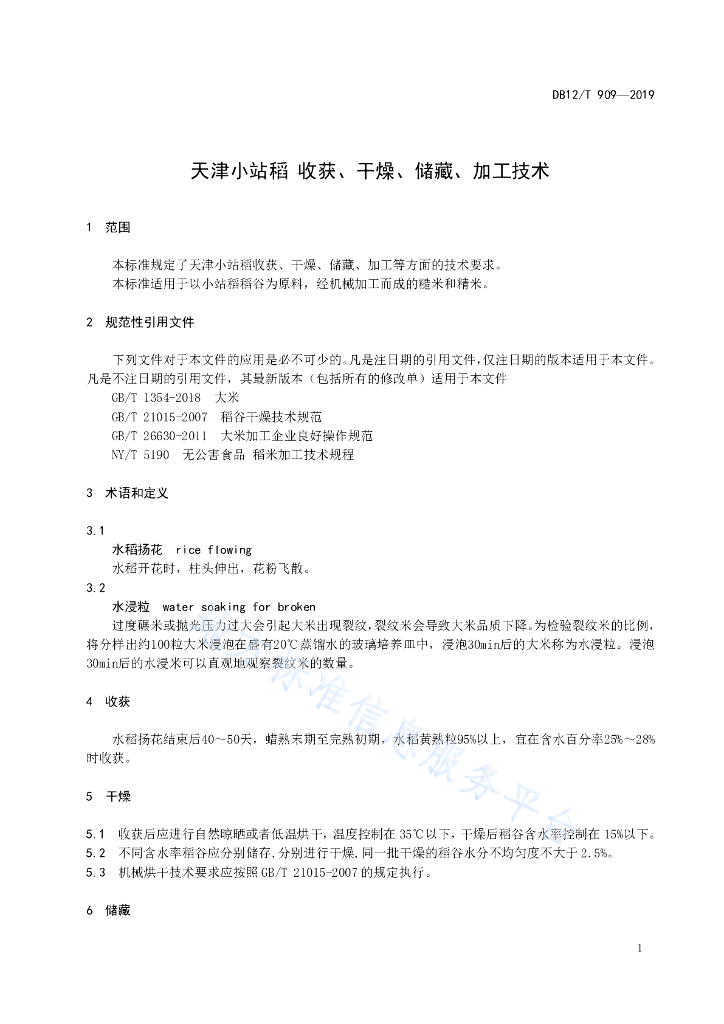DB12/T 909-2019 天津小站稻 收获、干燥、储藏、加工技术