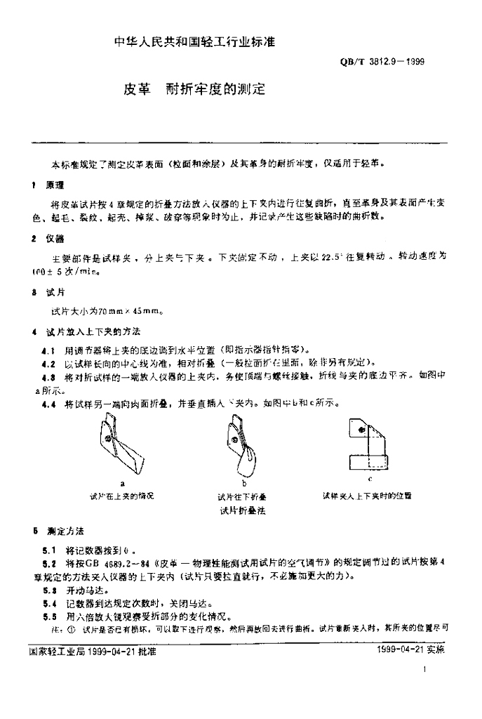 QB/T 3812.9-1999 皮革耐折牢度的测定