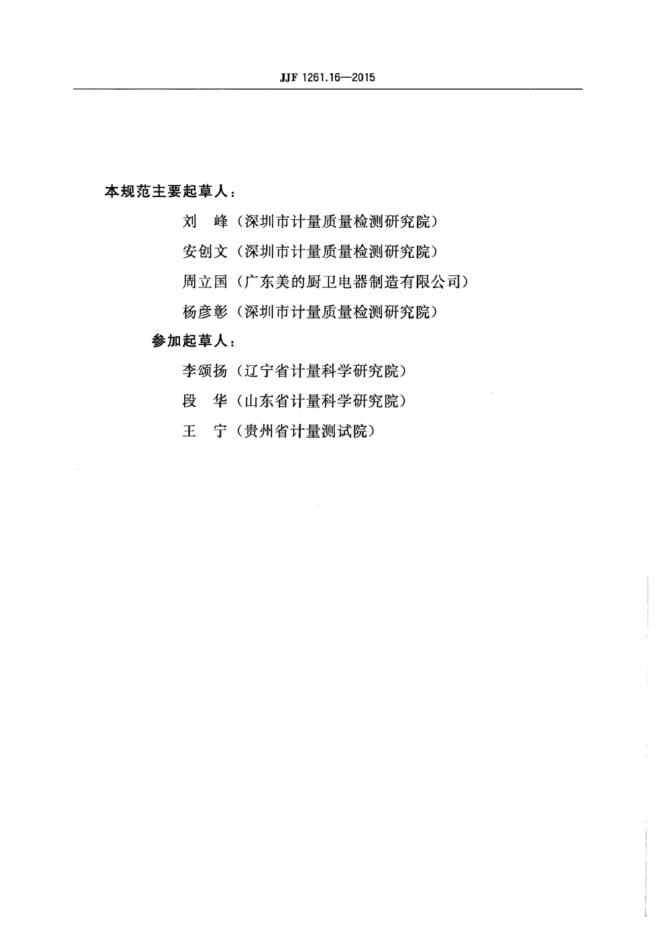 刘峰(深圳市计量质量检测研究院)、安创文(深圳市计量质量检测研究院)、周立国(广东美的厨卫电器制造有限公司)、杨彦彰(深圳市计量质量检测研究院)、李颂扬(辽宁省计量科学研究院)、段华(山东省计量科学研究院)、王宁(贵州省计量测试院)