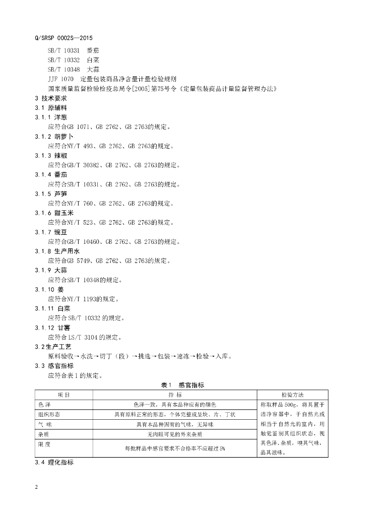 Q/SRSP 0002S-2015 山东晶荣食品有限公司速冻生制蔬菜