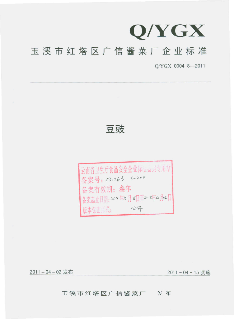 Q/YGX 0004S-2011 豆豉