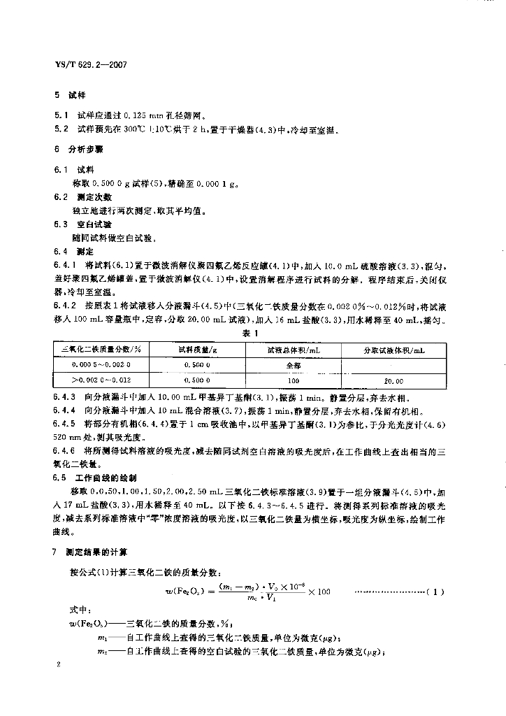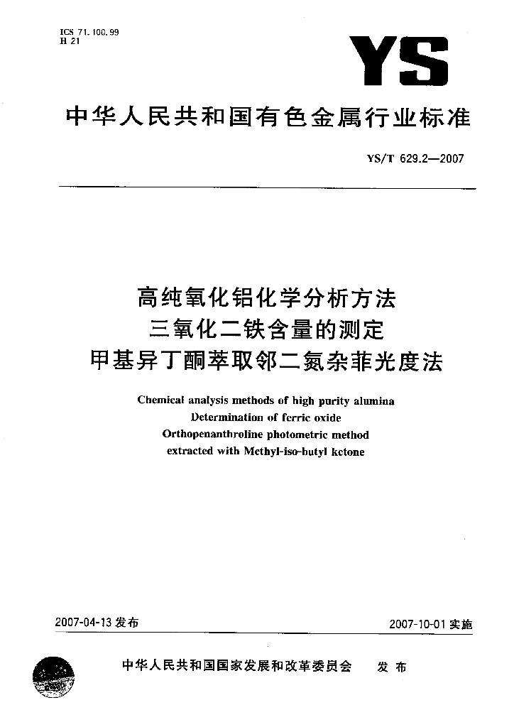 YS/T 629.2-2007 高纯氧化铝化学分析方法 三氧化二铁含量的测定 甲基异丁酮萃取邻二氮杂菲光度法
