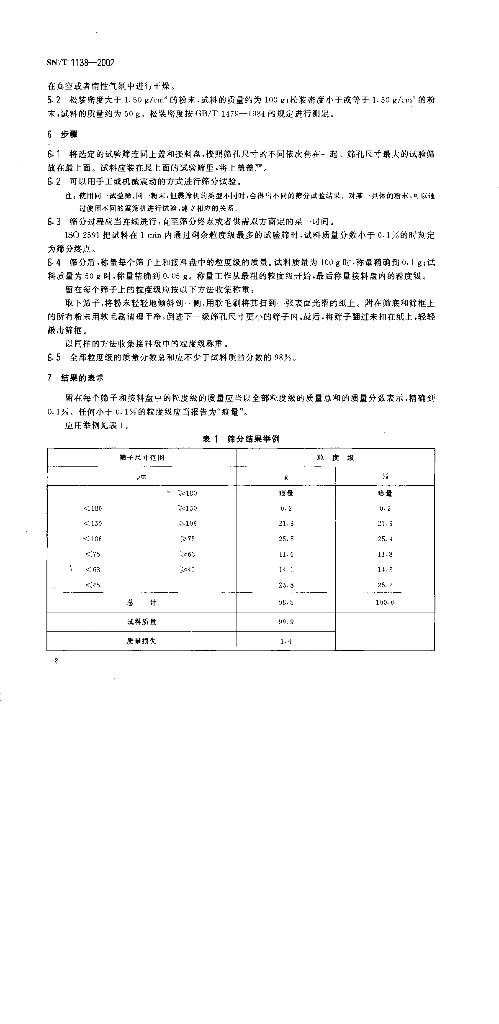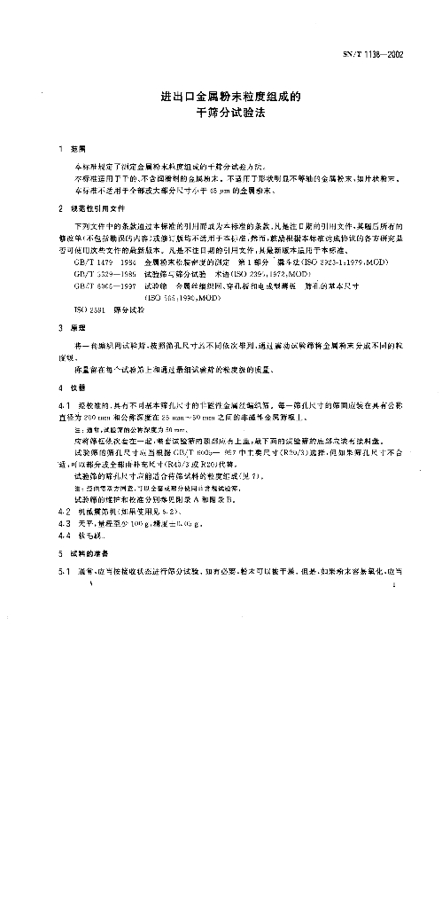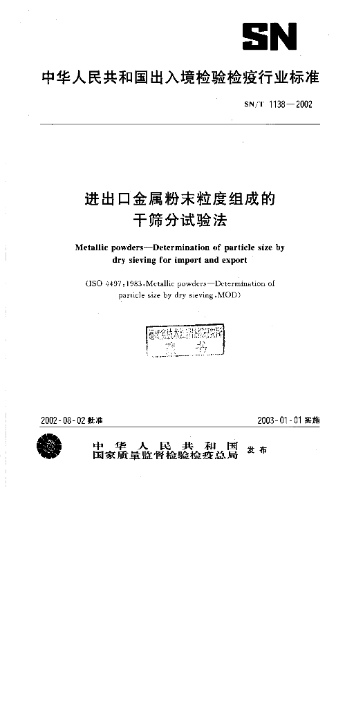 SN/T 1138-2002 进出口金属粉末粒度组成的干筛分试验法