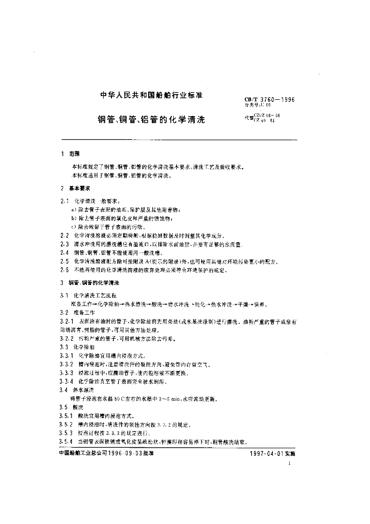CB/T 3760-1996 钢管、铜管、铝管的化学清洗