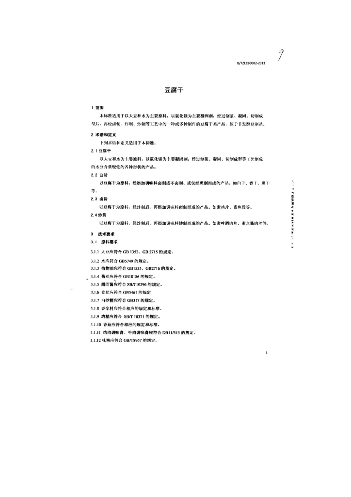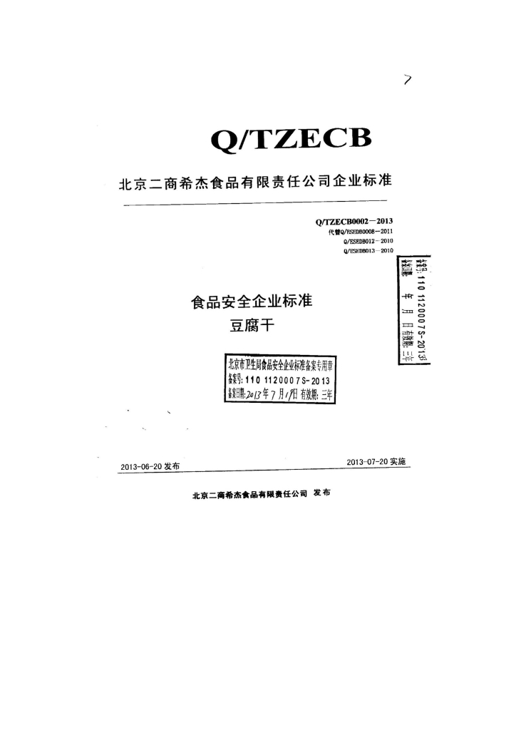 Q/TZECB 0002-2013 北京二商希杰食品有限责任公司 豆腐干