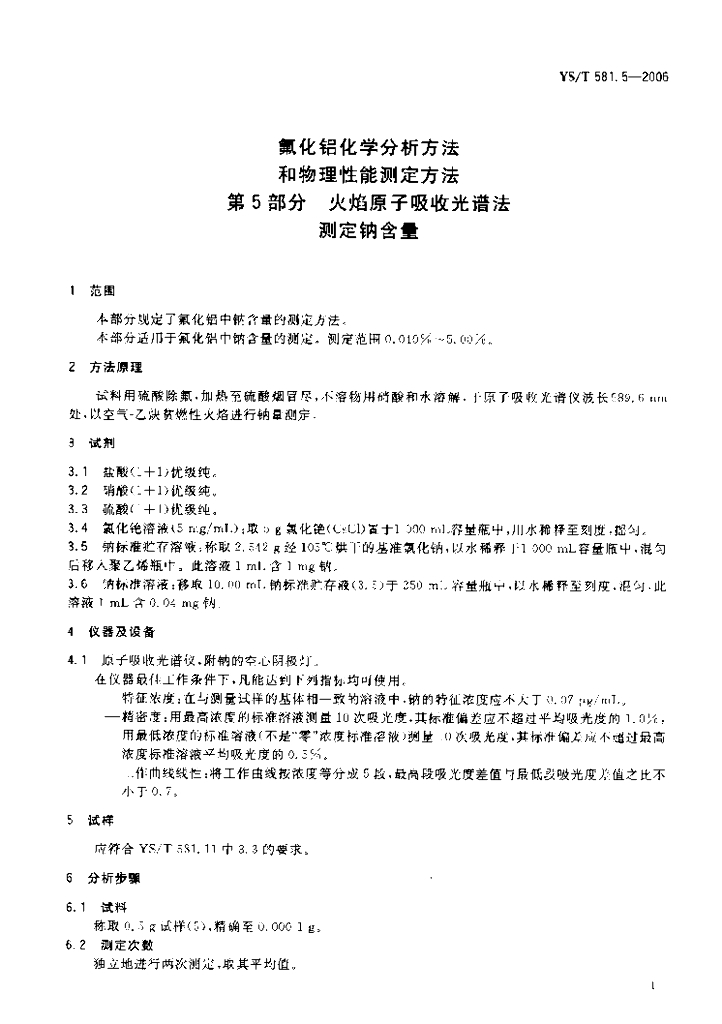YS/T 581.5-2006 氟化铝化学分析方法和物理性能测定方法 第5部分:火焰原子吸收光谱法测定钠含量