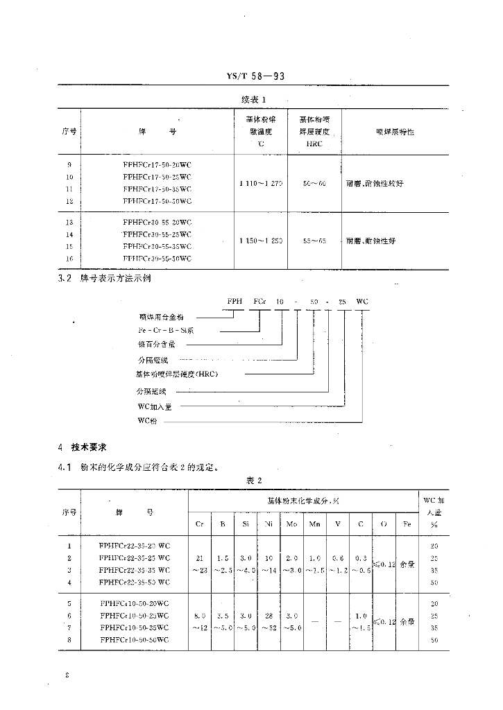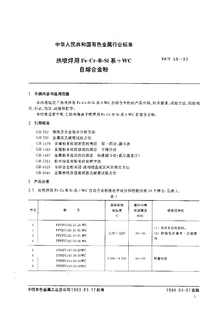 YS/T 58-1993 热喷焊用Fe-Cr-B-Si系+WC自熔合金粉