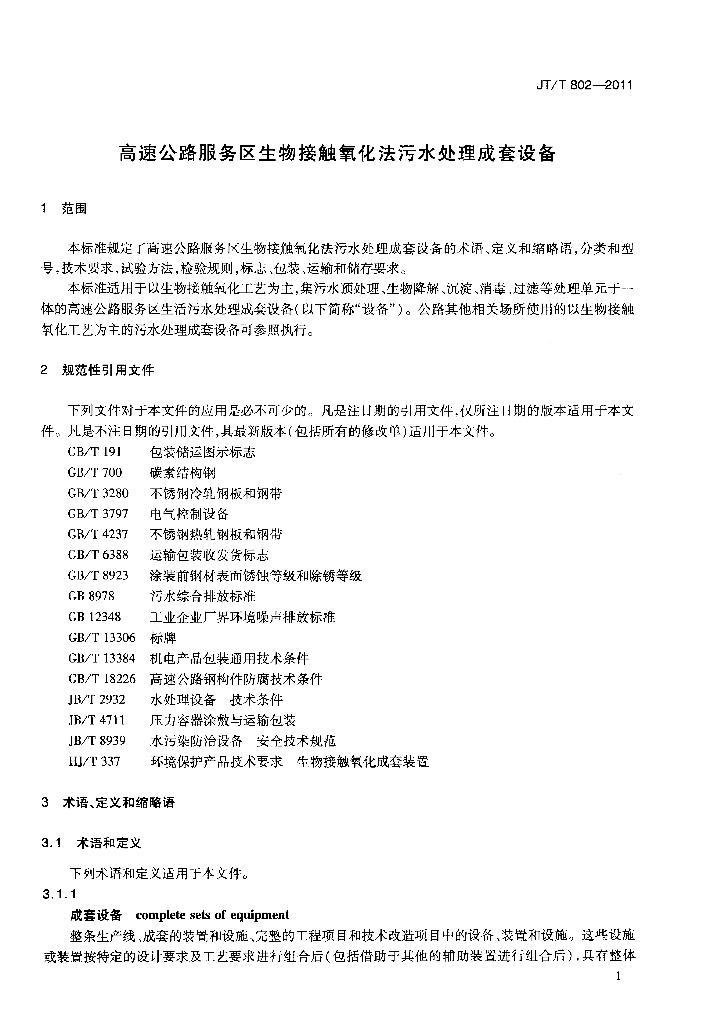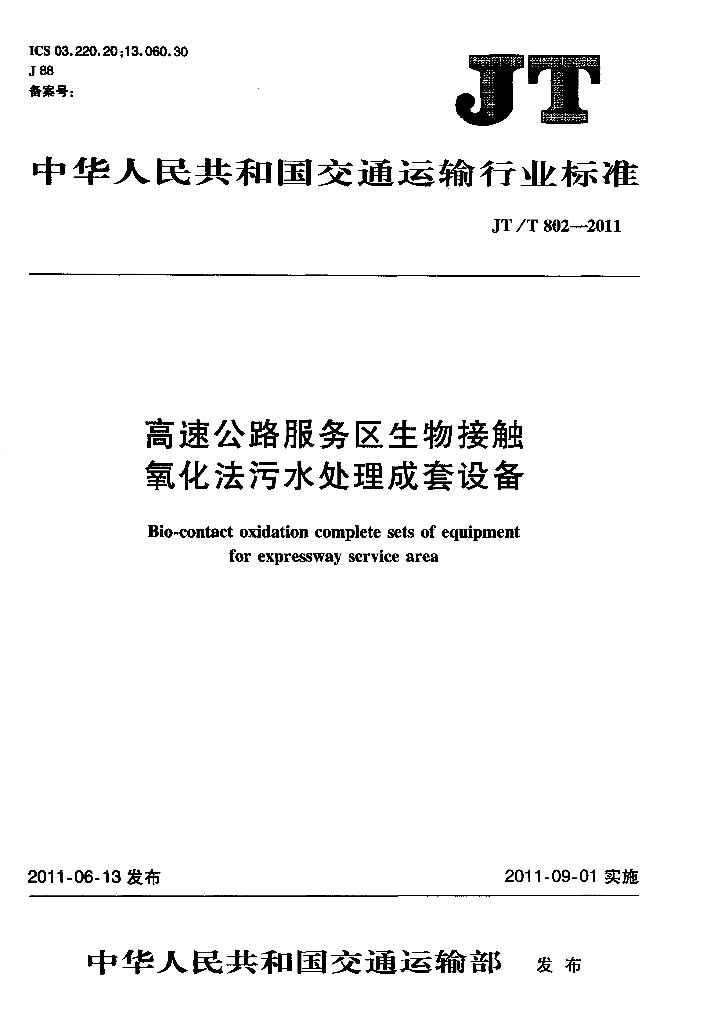 JT/T 802-2011 高速公路服务区生物接触氧化法污水处理成套设备