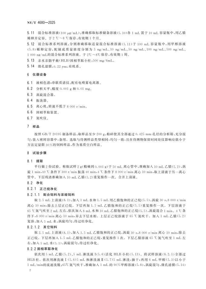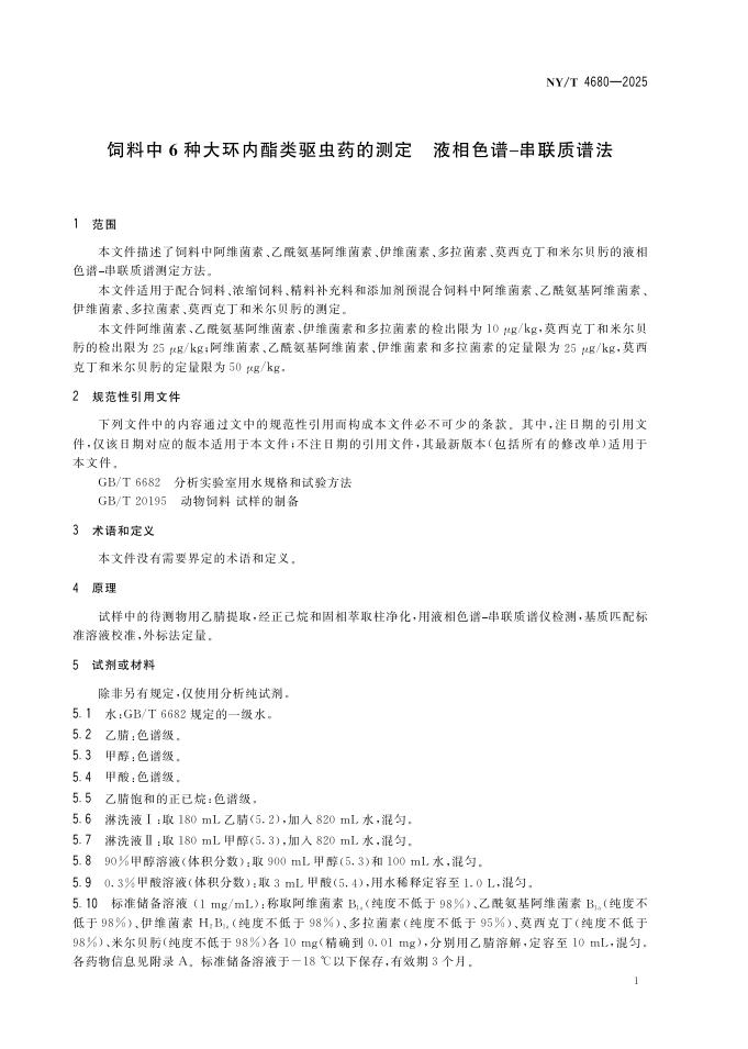 NY/T 4680-2025 饲料中6种大环内酯类驱虫药的测定 液相色谱-串联质谱法