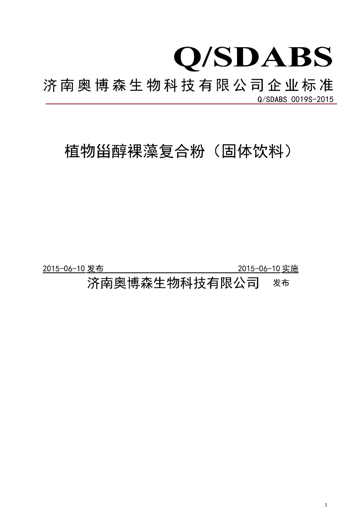 Q/SDABS 0019S-2015 济南奥博森生物科技有限公司 植物甾醇裸藻复合粉(固体饮料)