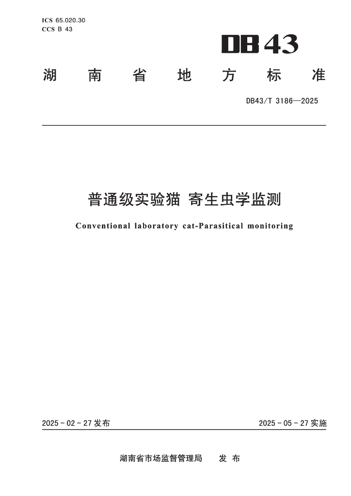 DB43/T 3186-2025 普通级实验用猫寄生虫学监测