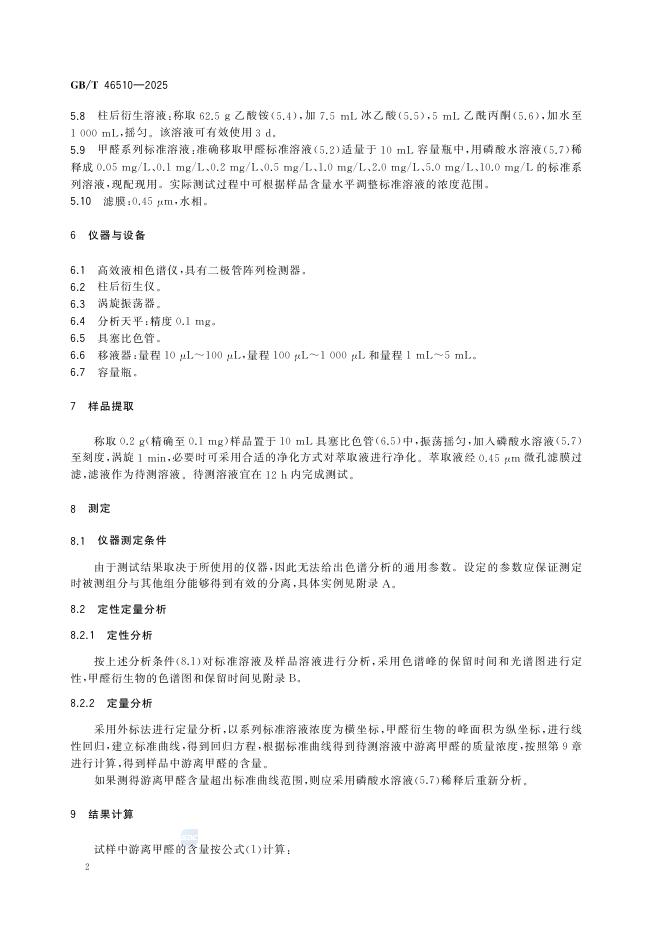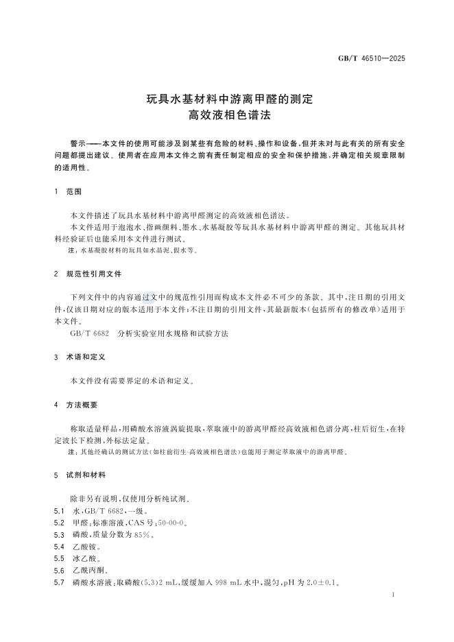 GB/T 46510-2025 玩具水基材料中游离甲醛的测定 高效液相色谱法