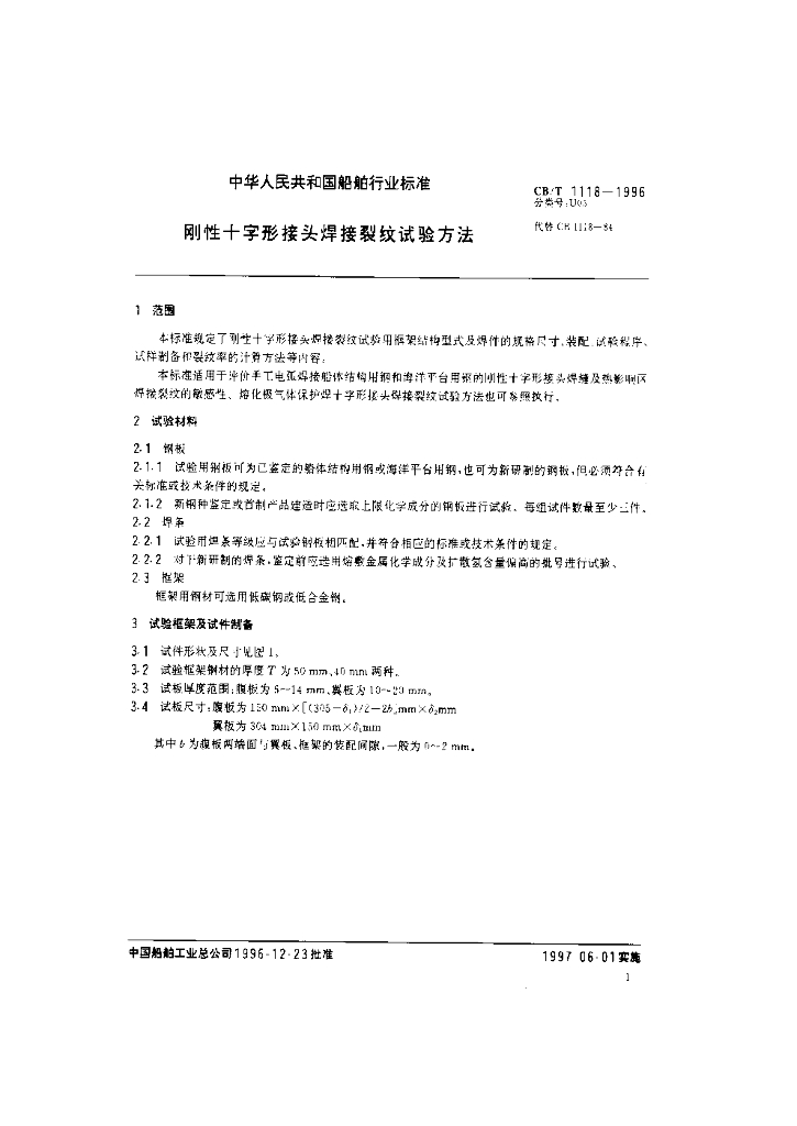 CB/T 1118-1996 刚性十字形接头焊接裂纹试验方法
