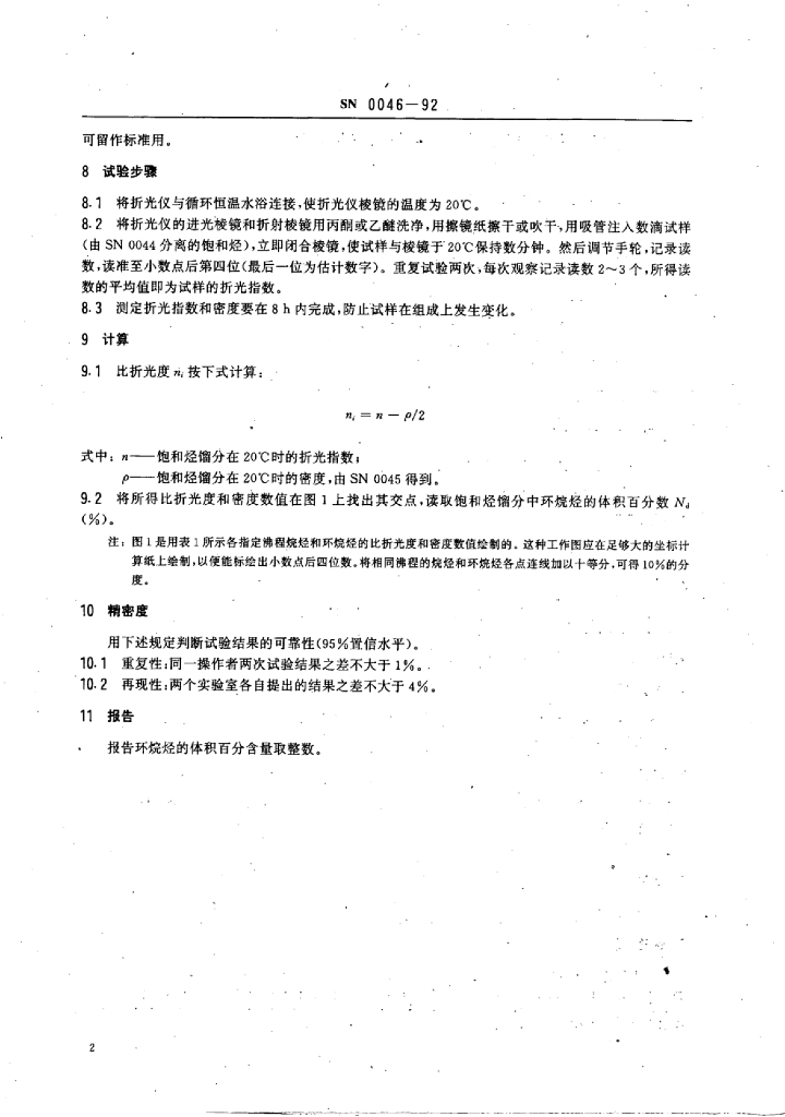 SN 0046-1992 出口石脑油PONA值检验方法比折光度法测定饱和烃馏分中的环烷烃