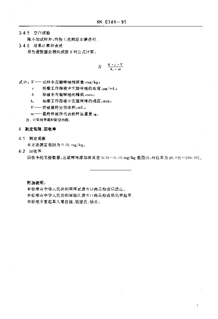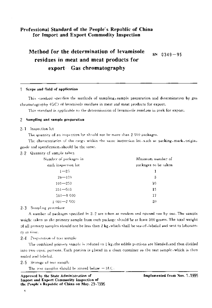 SN 0349-1995 出口肉及肉制品中左旋咪唑残留量检验方法 气相色谱法