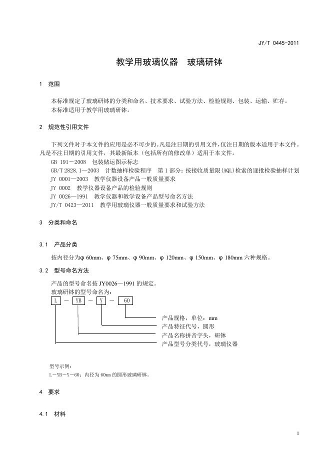 JY/T 0445-2011 教学用玻璃仪器 玻璃研钵