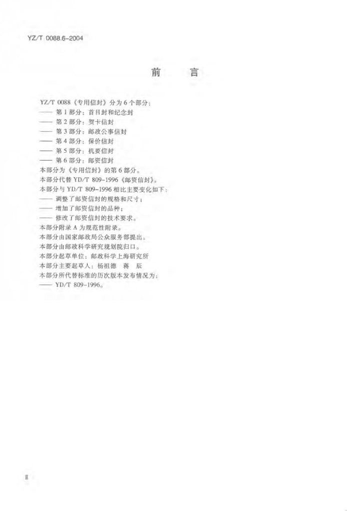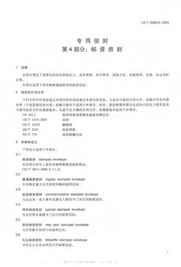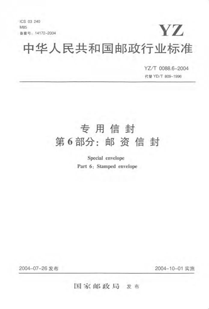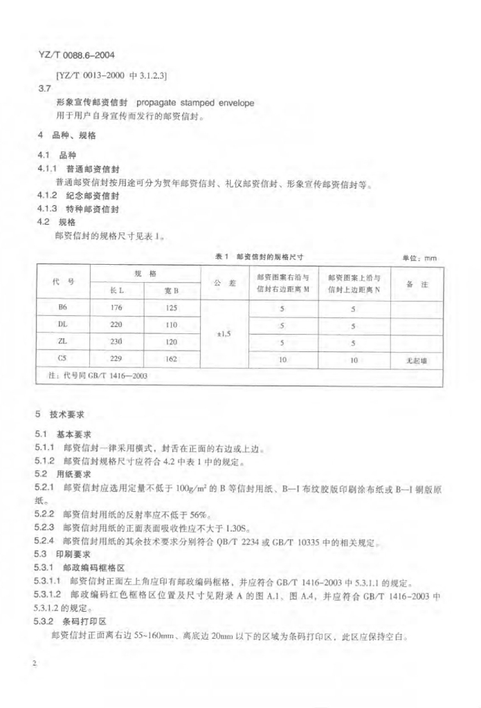 YZ/T 0088.6-2004 专用信封 第6部分:邮资信封