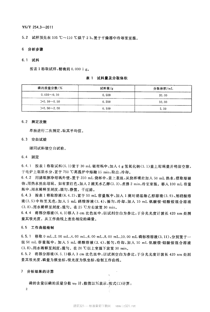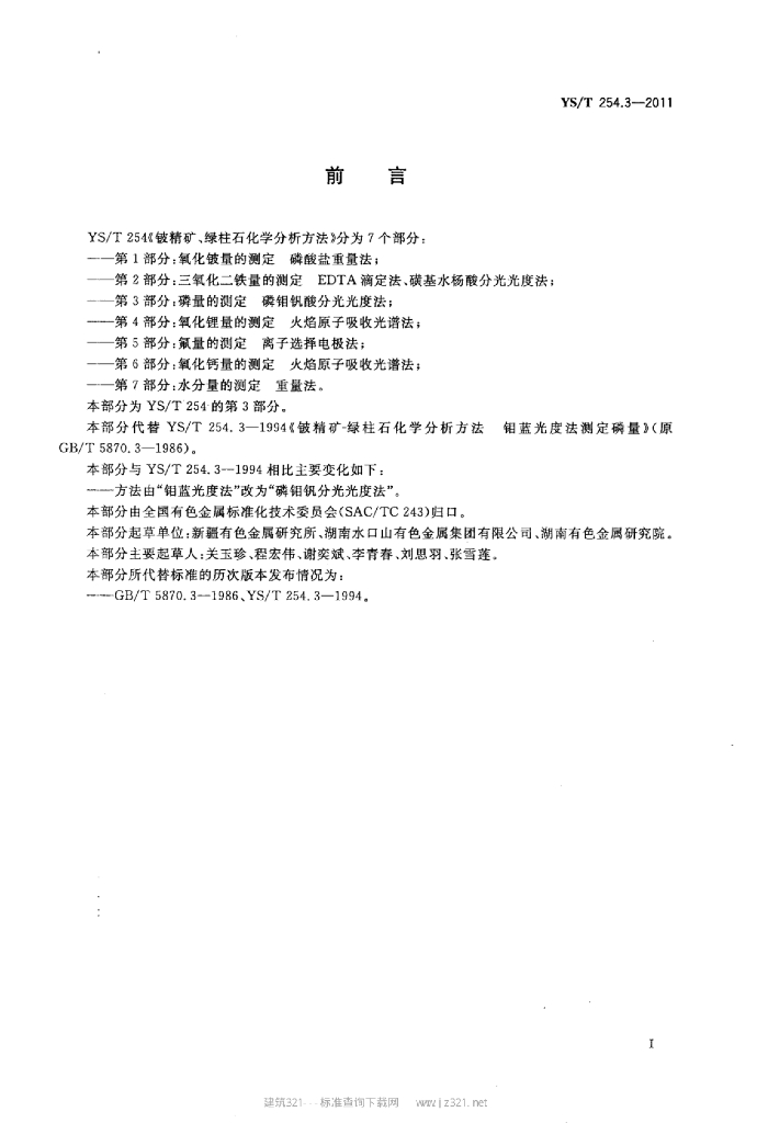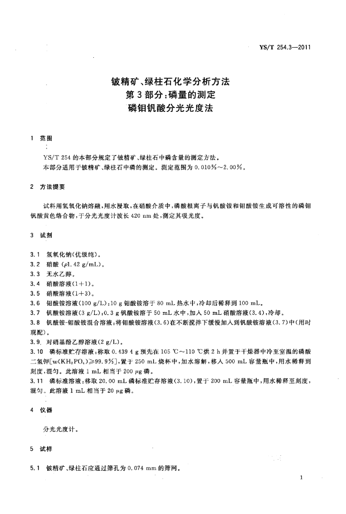 YS/T 254.3-2011 铍精矿、绿柱石化学分析方法 第3部分:磷量的测定磷钼钒酸分光光度法