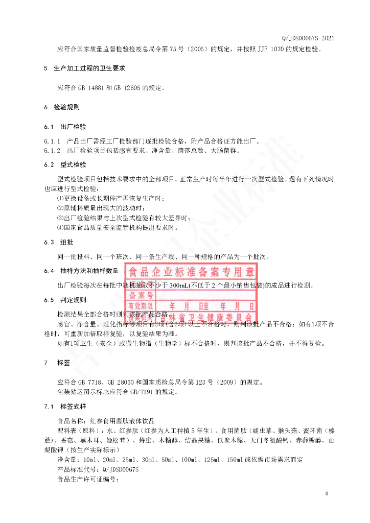 Q/JDSD 0067S-2021 红参食用菌肽液体饮品