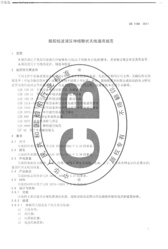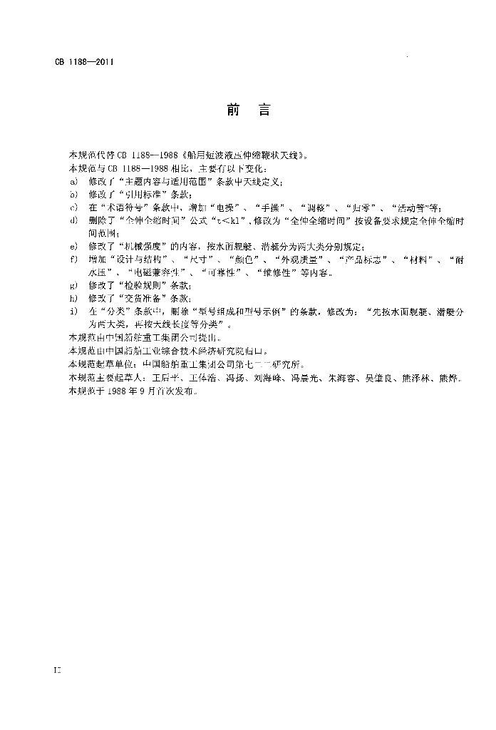 CB 1188-2011 舰船短波液压伸缩鞭状天线通用规范