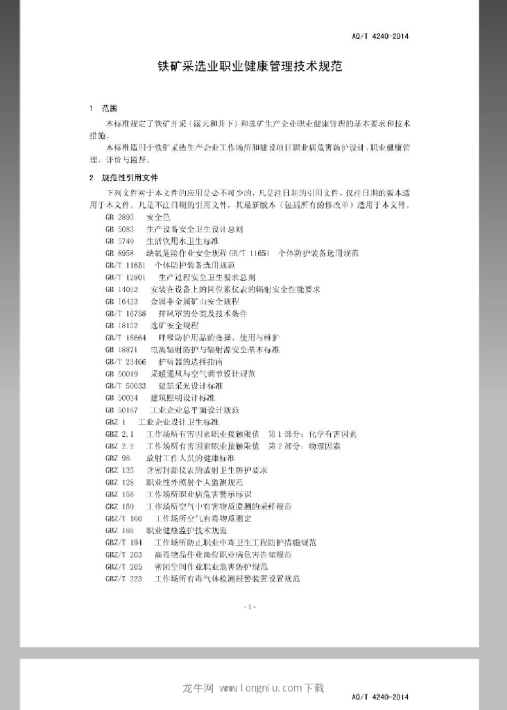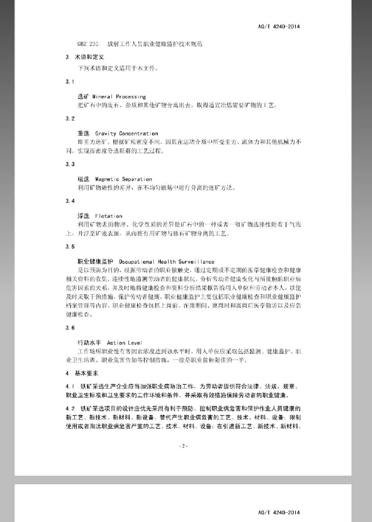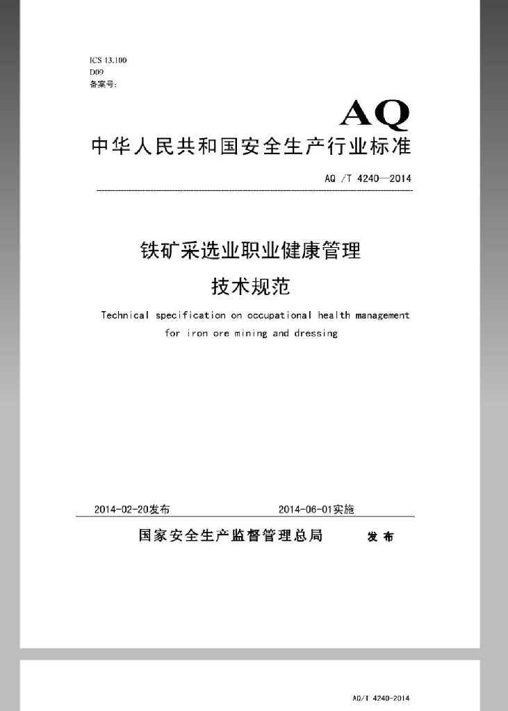 AQ/T 4240-2014 铁矿采选业职业健康管理技术规范
