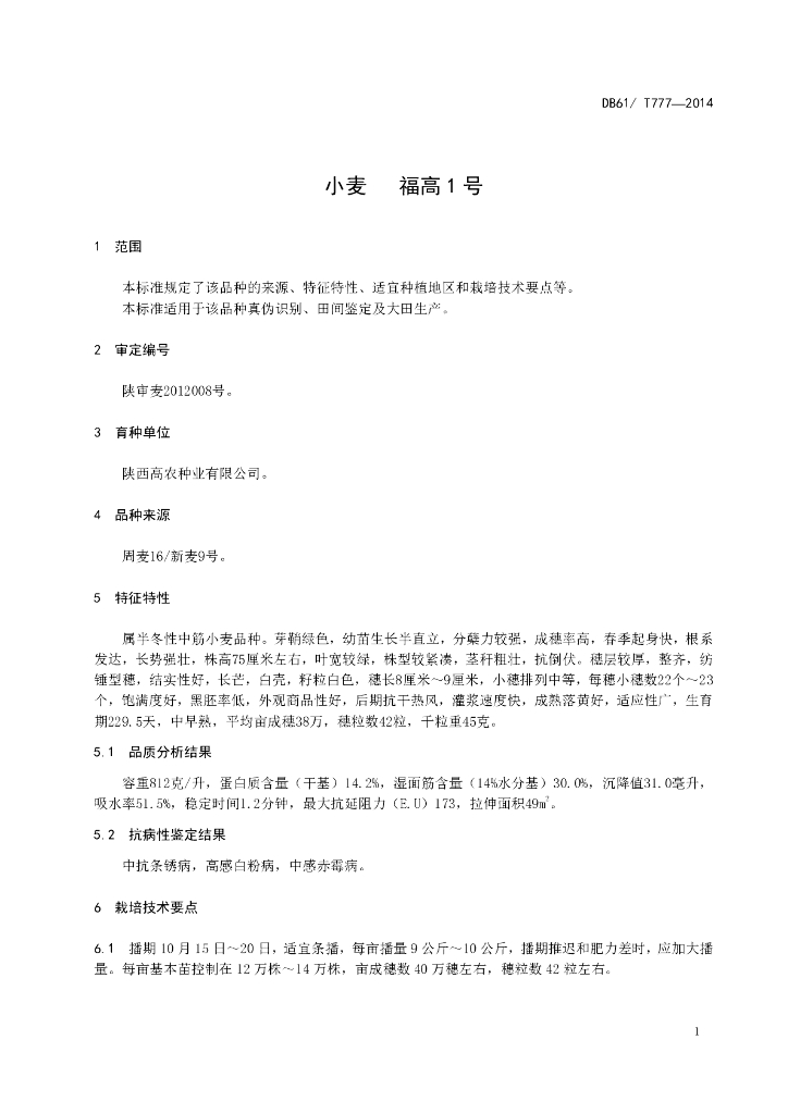 DB61/T 777-2014 小麦 福高1号