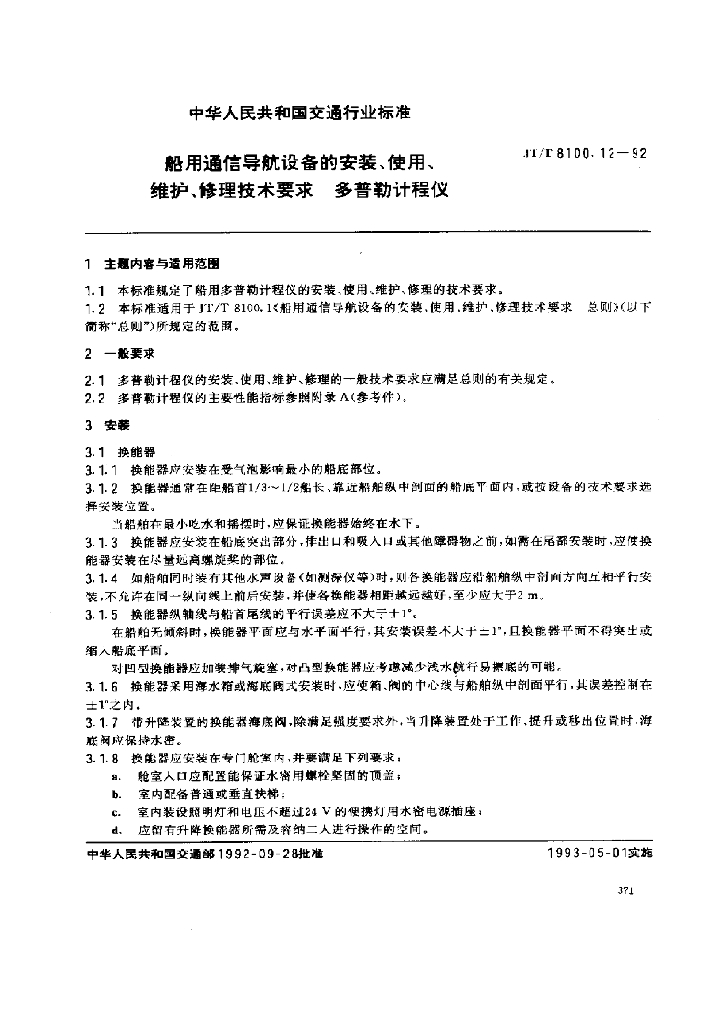 JT/T 8100.12-1992 船用通信导航设备的安装、使用、维护、修理技术要求多普勒计程仪
