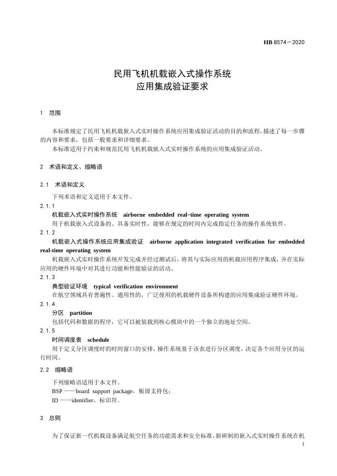 HB 8574-2020 民用飞机机载嵌入式操作系统应用集成验证要求