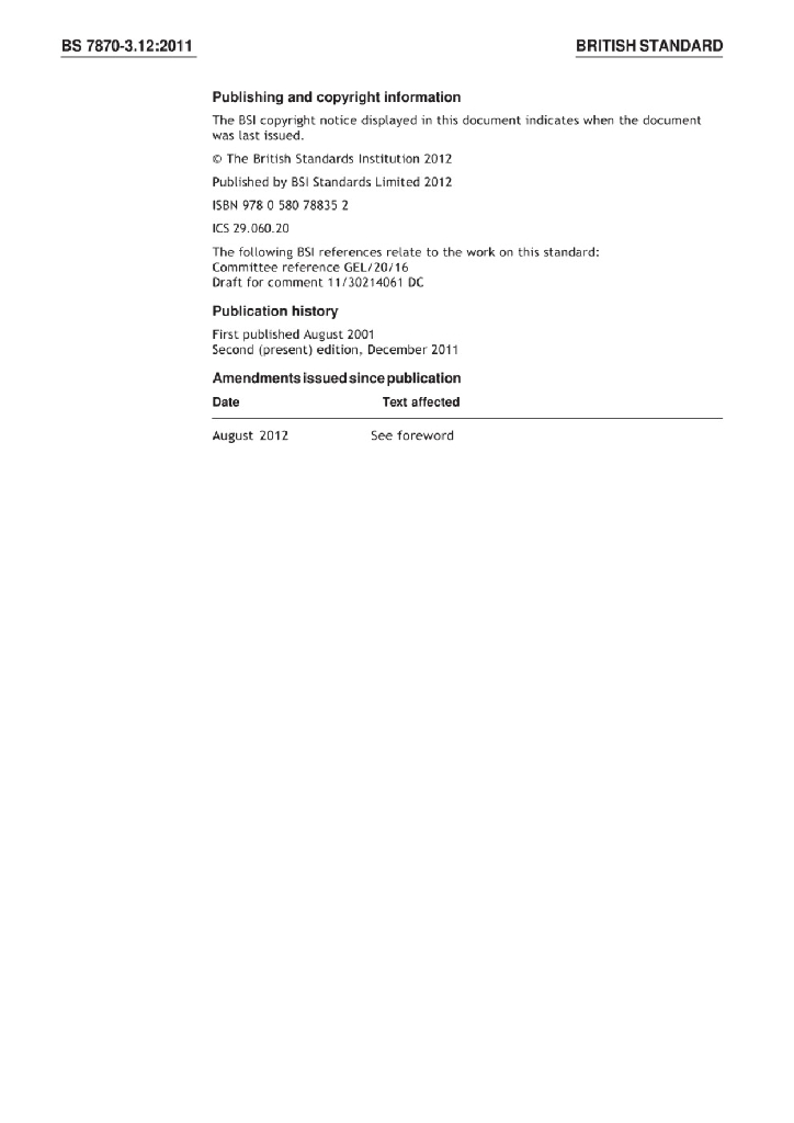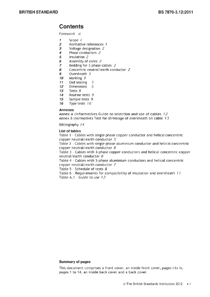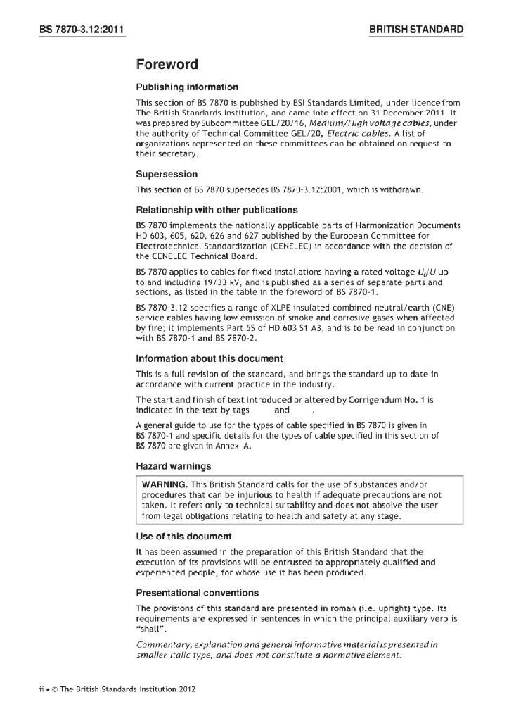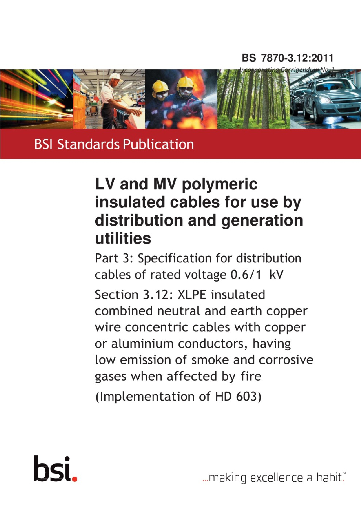 BS 7870-3.12:2011 配电和发电用中低压聚合物绝缘电缆 额定电压0.6 1kV配电电缆规范 铜或铝导体交联聚乙烯绝缘带铜芯中性线和地线低烟无卤同心电缆