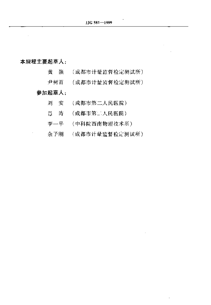 黄强(成都市计量监督检定测试所)、尹树百(成都市计量监督检定测试所)、刘安(成都市第二人民医院)、吕涛(成都市第二人民医院)、李一平(中科院西南物理技术所)、余子刚(成都市计量监督检定测试所)