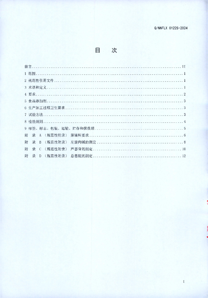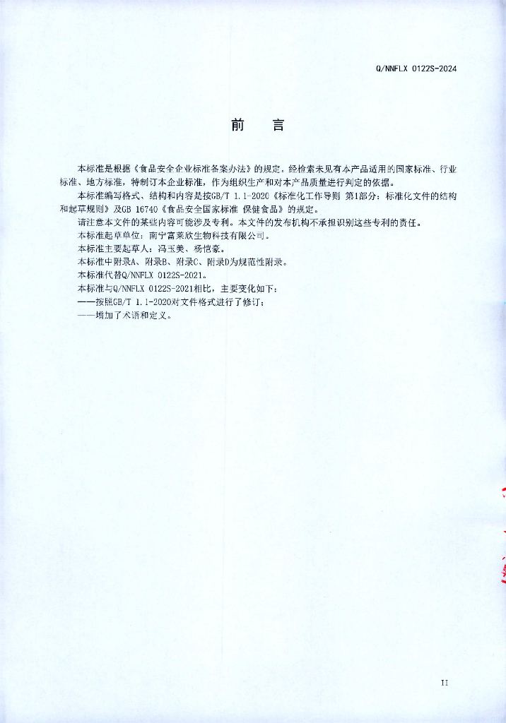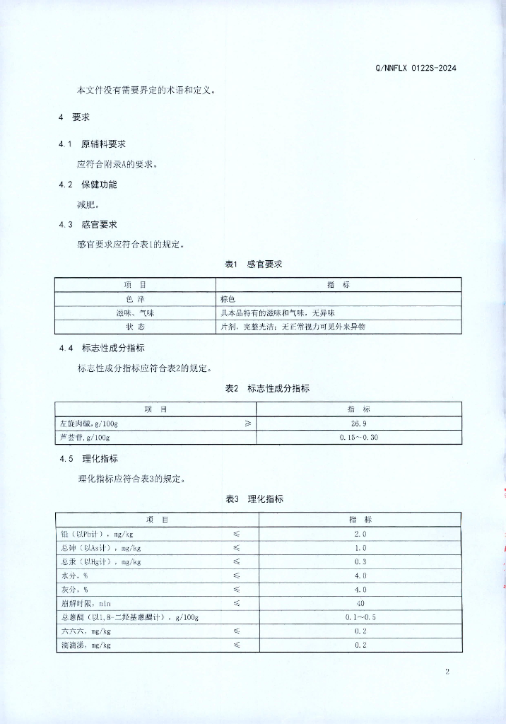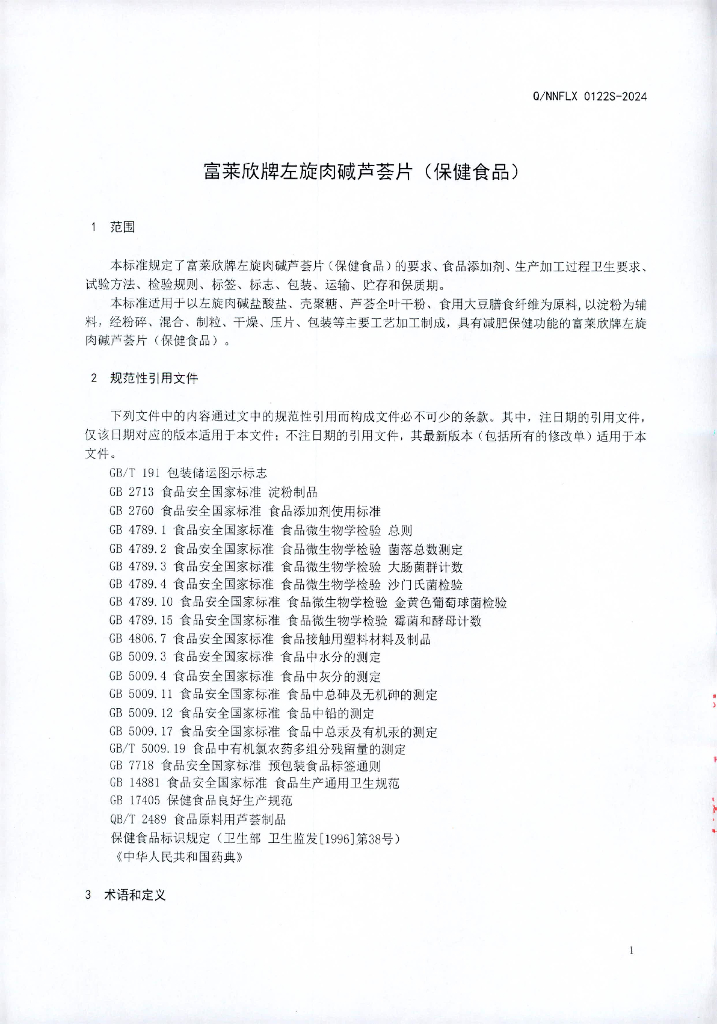 Q/NNFLX 0122S-2024 富莱欣牌左旋肉碱芦荟片(保健食品)