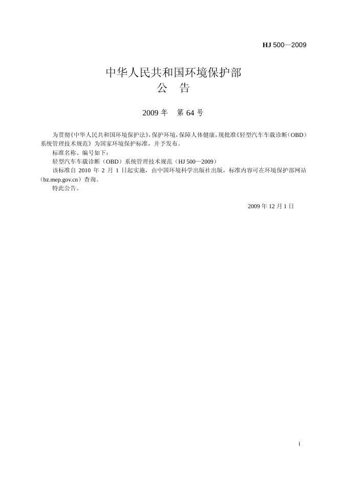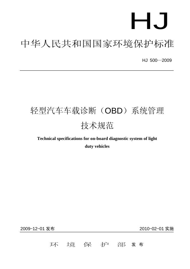 HJ 500-2009 轻型汽车车载诊断(OBD)系统管理技术规范