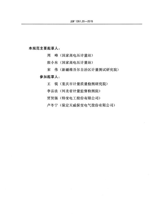 周峰(国家高电压计量站)、殷小东(国家高电压计量站)、宋伟(新疆维吾尔自治区计量测试研究院)、王锐(重庆市计量质量检测研究院)、李县法(河北省计量监督检测院)、贾贺强(特变电工股份有限公司)、卢冬宁(保定天威保变电气股份有限公司)
