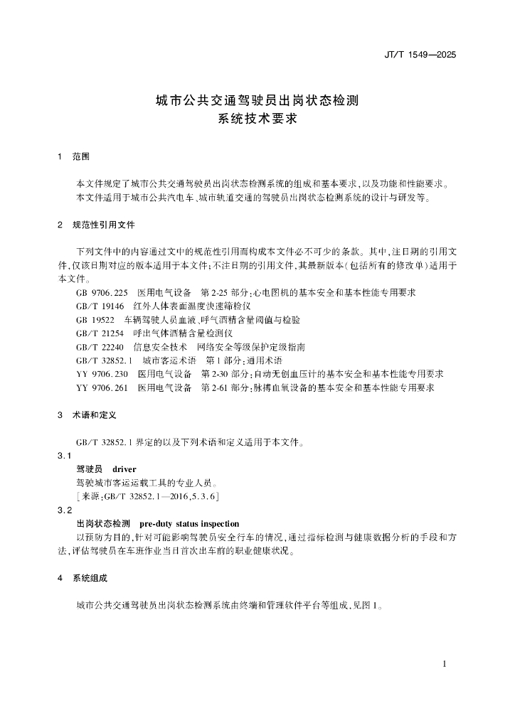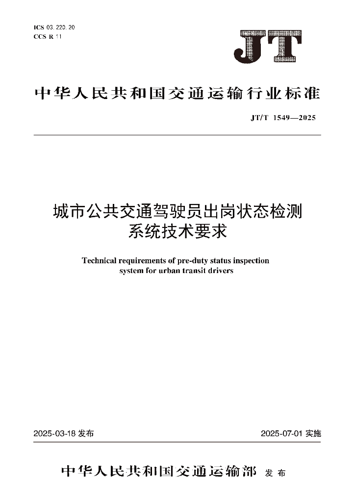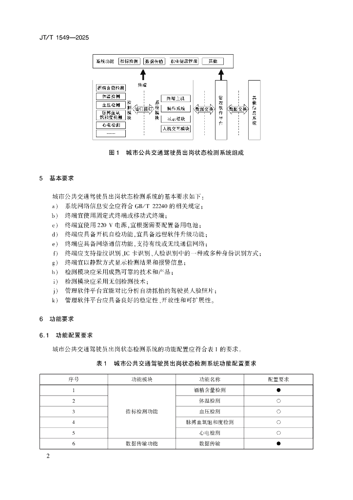 JT/T 1549-2025 城市公共交通驾驶员出岗状态检测系统技术要求