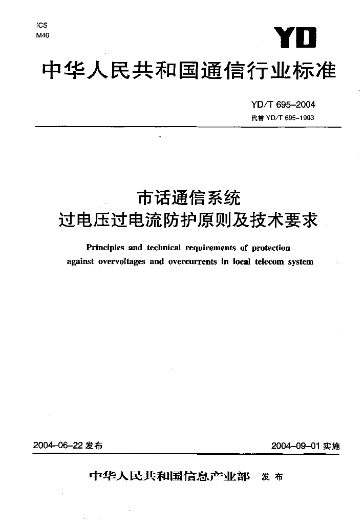 YD/T 695-2004 市话通信系统过电压过电流防护原则及技术要求