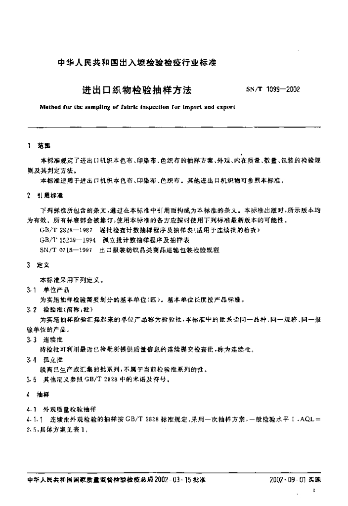 SN/T 1099-2002 进出口织物检验抽样方法