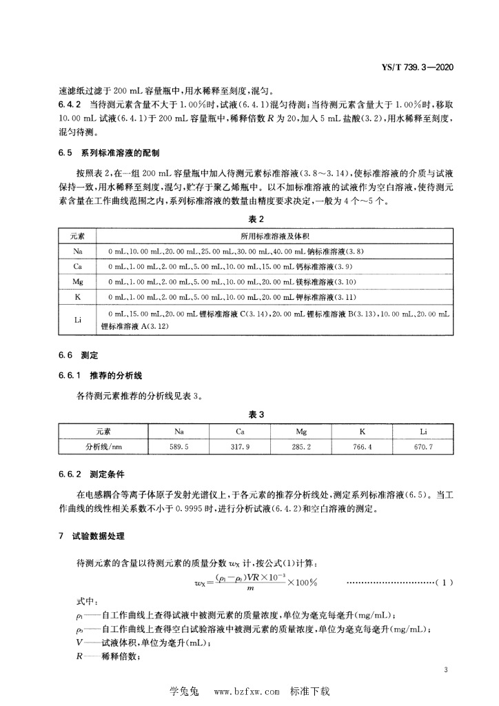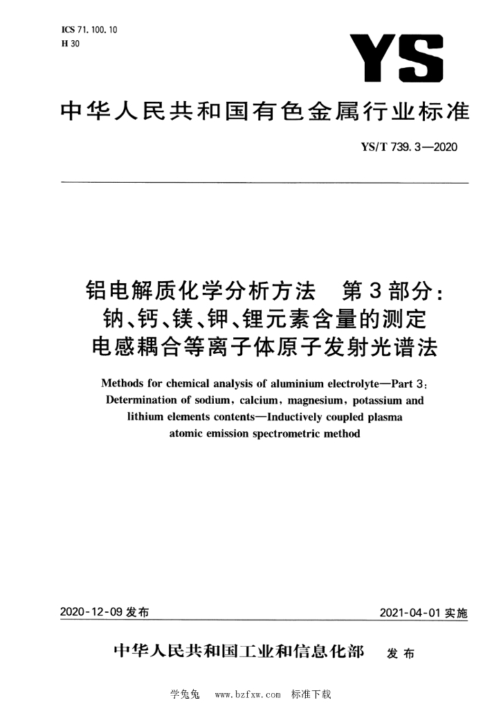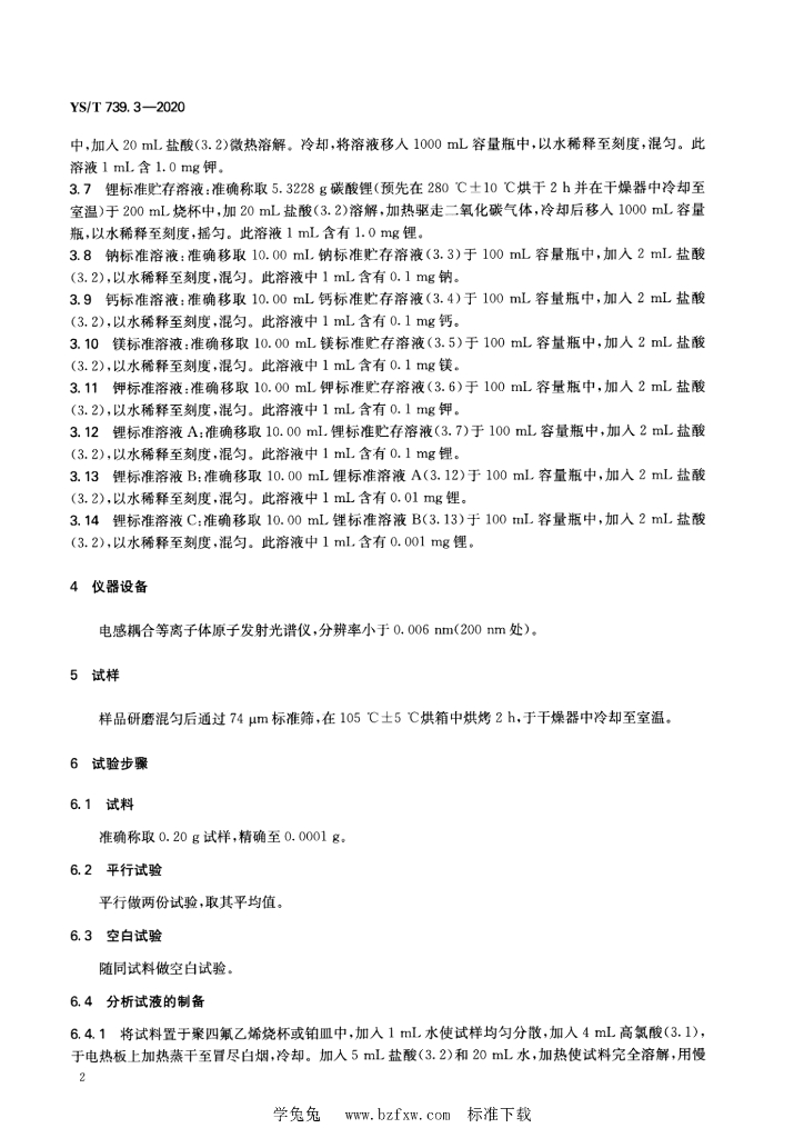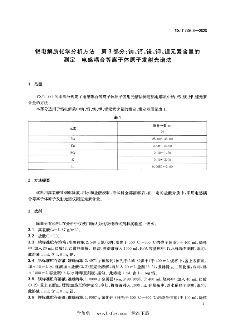 YS/T 739.3-2020 铝电解质化学分析方法 第3部分:钠、钙、镁、钾、锂元素含量的测定 电感耦合等离子体原子发射光谱法