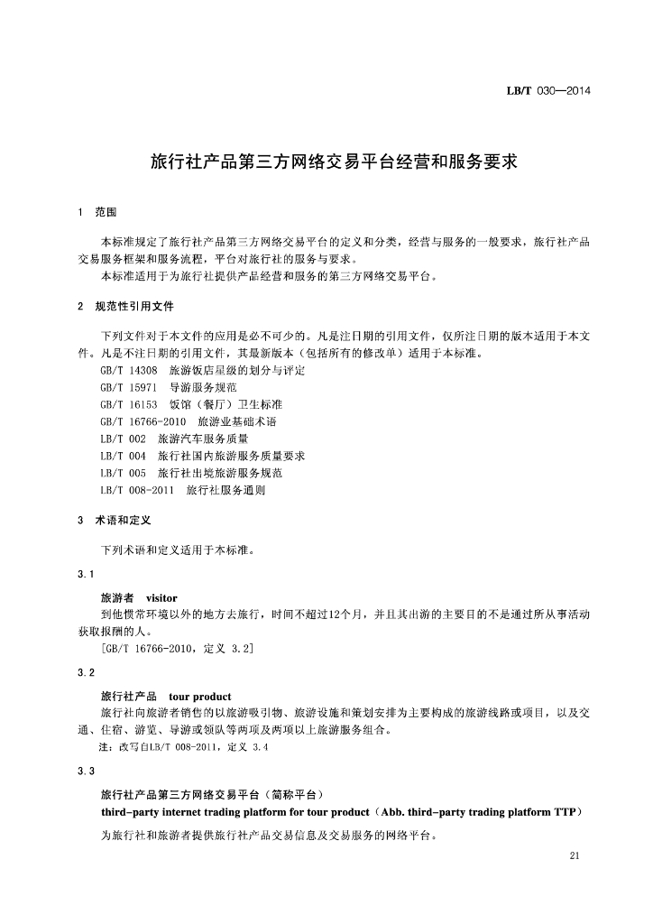 LB/T 030-2014 旅行社产品第三方网络交易平台经营和服务要求
