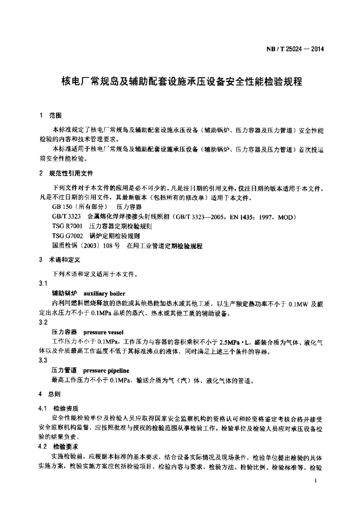 NB/T 25024-2014 核电厂常规岛及辅助配套设施承压 设备安全性能检验规程